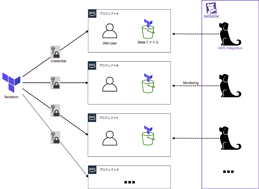 Terraformで各プロジェクトアカウントに対してAWS Integrationを導入しようとしたとき、アカウントひとつひとつにTerraform用のユーザを用意することを考えました。