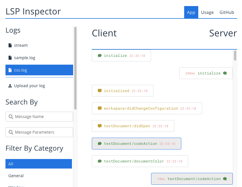 JSON-RPC は JSON なのでヒューマンリーダブル、と言いたいところですが、実際のところは大量に通信が発生するため、生の JSON では理解が難しいことがあります。 LSP のサイトで利用できる LSP Inspector というツールを利用すると、リクエストとレスポンスを対応付けたり、特定種類の通信に限定して表示したりできるので、理解がはかどります。
