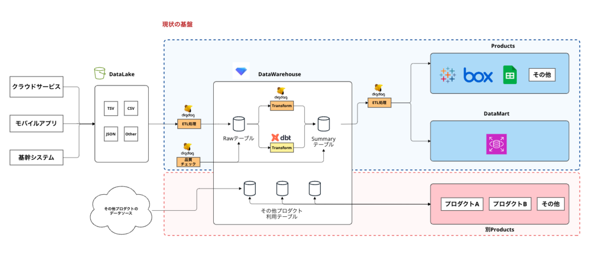 そこからDigdag・Embulkなどを用いて、DWH(TreasureData)へデータを格納し、そこから各種プロダクトへ利用するような形となっています。